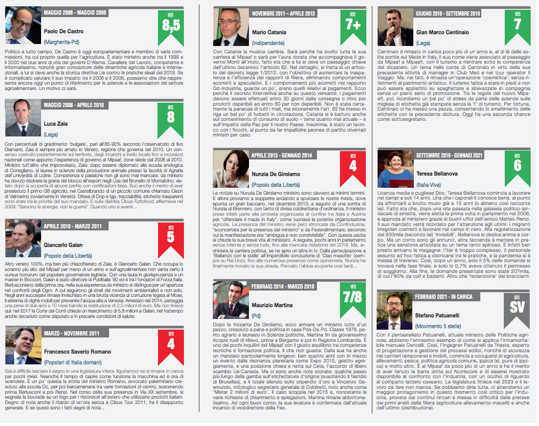 “Nei fatti – scrive il pagellone – è rimasta un’operazione cosmetica, senza un piano serio di promozione. Tra le tegole del nuovo Mipaaft, poi, ricordiamo un bel po’ di stress da parte delle aziende sulle migliaia di etichette già stampate senza la t di turismo. Per fortuna, Centinaio ci ha messo una pezza, consentendo lo smaltimento delle etichette con la precedente dicitura. Oggi ha una seconda chance come sottosegretario”.
