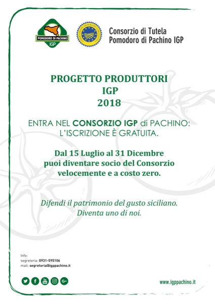 Aumentare la base di produttori che aderiscono al Consorzio nonché il numero di prodotto certificato Igp sul mercato. Con queste premesse e obiettivi il Conosorzio Tutela Pomodoro di Pachino Igp ha appena lanciato il “Progetto Produttore”, iniziativa valida fino al 31 dicembre 2018 e che consente di diventare socio velocemente e a costo zero iscrivendosi all’ Istituto Zooprofilattico Sperimentale della Sicilia per ottenere la certificazione a marchio IGP.