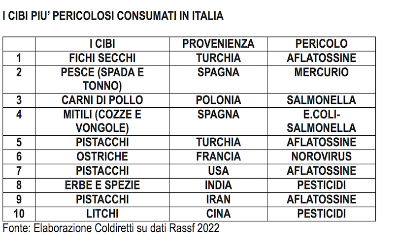 “In Italia – sottolinea Coldiretti – oltre otto prodotti su dieci pericolosi per la sicurezza alimentare provengono dall’estero (86%). Sul totale dei 317 allarmi rilevati nel 2022 – evidenzia Coldiretti – 106 scaturivano da importazioni da altri Stati dell’Unione Europea (33%) e 167 da Paesi extracomunitari (53%) e solo 44 (14%) hanno riguardato prodotti con origine nazionale. I pericoli maggiori per la salute dei consumatori italiani sono venuti dai fichi secchi della Turchia per le aflatossine, seguito dal pesce spagnolo, per l’alto contenuto di mercurio, dalla carne di pollo polacca contaminata da salmonella e poi da cozze e vongole spagnole sempre con salmonella insieme al batterio dell’escherichia coli. Molto pericolosi anche i pistacchi da Turchia, Iran e anche Stati Uniti per l’elevato contenuto di aflatossine cancerogene nonché le erbe e le spezie dall’India e i litchi dalla Cina per la presenza di pesticidi oltre i limiti consentiti, ma non mancano neppure le ostriche francesi al norovirus che provoca violente gastroenteriti. Un’emergenza quindi che non riguarda solo i Paesi in via di sviluppo ma che, per effetto della globalizzazione degli scambi e della competizione al ribasso sui prezzi, si estende anche a quelli più ricchi”.