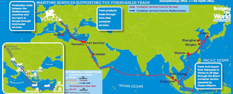 “Rispetto al comparto dei deperibili è il momento di giocare la nostra partita dato che possiamo contare su diversi assi – ha spiegato a Fruit Logistica durante un press meeting il presidente del Porto di Venezia Pino Musolino – oltre al significativo incremento dell'export nel settore ortofrutta e deperibili che riscontriamo nei servizi marittimi diretti con i Paesi del Mediterraneo, il servizio diretto con il Far East ha portato in dote l'import di ananas dall'Indonesia aprendo ad altre tipologie di frutta fresca da importare tramite il nostro scalo”. A questi servizi si aggiunge il servizio ro-ro con la Grecia che mette in connessione questo mercato con il centro d'Europa (attraverso il servizio intermodale su treno fino a Francoforte) sempre per quanto riguarda i prodotti deperibili.