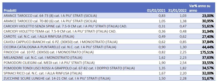 I forti rialzi dei prezzi all'ingrosso registrati nell'ultima settimana, per qualche prodotto in particolare, oltre a dipendere dai recenti cambiamenti climatici, dipendono anche dall'aumento dei costi dell'energia elettrica, utilizzata per il riscaldamento delle serre, per l'attivazione delle pompe di irrigazione, così come l'aumento dei costi dei concimi e delle plastiche utilizzate (i teli per coprire le serre ne sono un esempio). Nello specifico, rispetto allo scorso anno, i prezzi all'ingrosso dei prodotti maggiormente colpiti da questi due fattori sono quelli dei pomodori (+35%), delle melanzane (+37%) e delle zucchine (+52%).