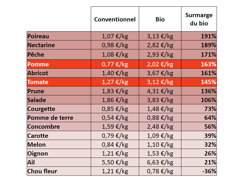 Il motivo, secondo lo studio di Que Choisir, è imputabile solo per la metà ai maggiori costi di produzione del bio. In realtà il 46% del costo aggiuntivo dei prodotti bio è dovuto ai margini particolarmente elevati applicati dalla grande distribuzione. Nel caso di frutta e verdura bio i margini lordi sono in media il 96% maggiori rispetto al convenzionale. E la marginalità in molti casi anche questa volta è superiore alla media, come nel caso delle mele (+163%) o dei pomodori (+145%), tra i più richiesti in Francia nel biologico secondo quanto afferma lo studio.