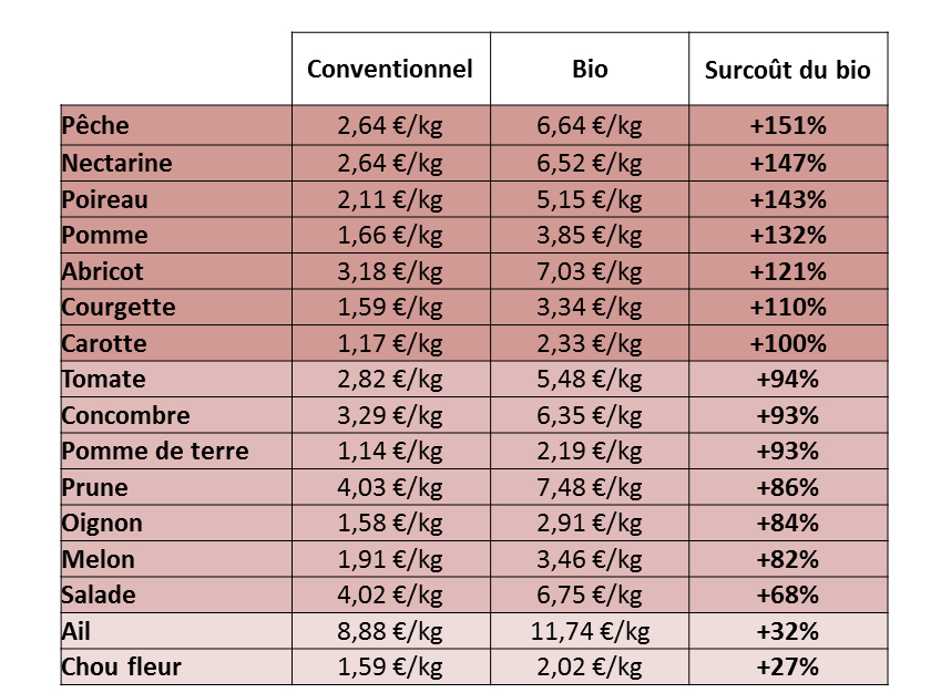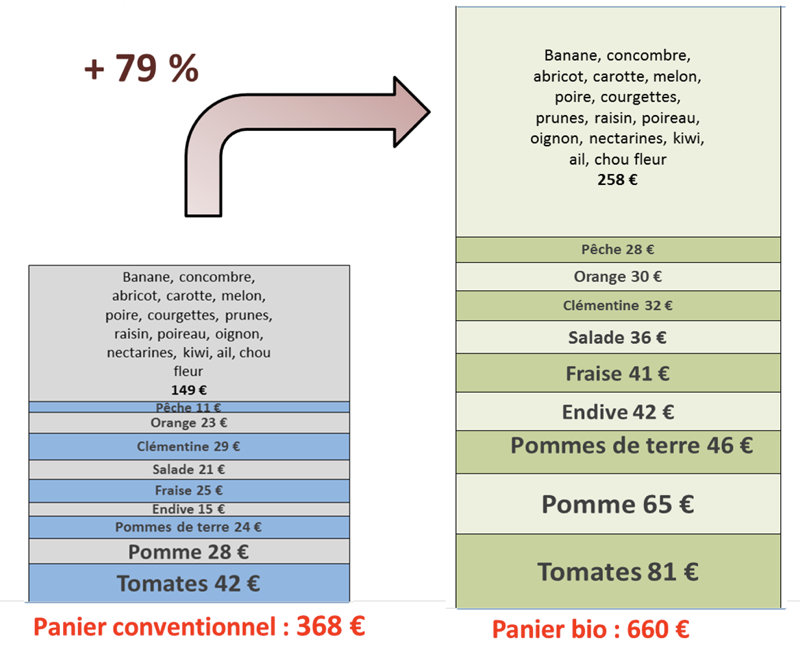 Costa cara una spesa bio di frutta e verdura in Francia, in media 660 euro all'anno contro i 368 degli prodotti convenzionali a parità di referenze, il 79% in più quindi.