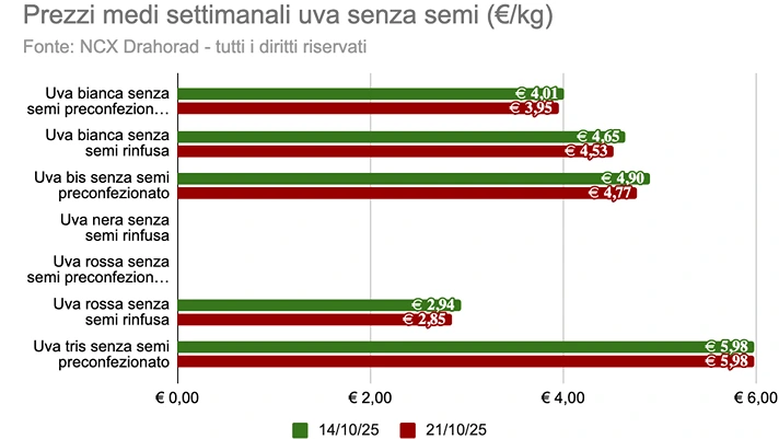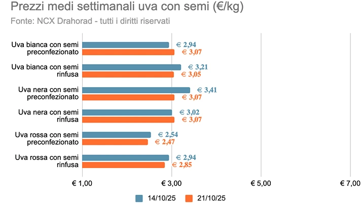 Il prezzo medio della categoria, escludendo biologico e premium, è stato di 3,73 euro/kg, stabile rispetto alla settimana precedente. Il prodotto con il prezzo più basso mediamente al chilogrammo è l'uva rossa con semi, attestata a 2,66 euro, con una diminuzione del 2,3% rispetto alla settimana prima. La referenza con il prezzo medio più elevato è stata l'uva bis senza semi (4,77 euro/kg), con una riduzione del 2,7%.