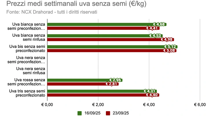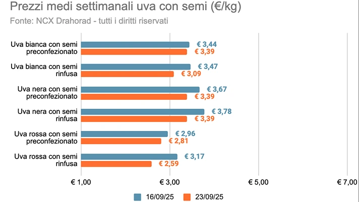Il prodotto dal prezzo al chilo mediamente più basso è risultato l'uva rossa con semi, quotata a 2,71 euro al chilo, con una variazione di -11,1% rispetto alla settimana precedente. Al contrario, la referenza con il prezzo al chilo più elevato è stata l'uva bis senza semi, a 5,08 euro al chilo, che ha subito una lieve flessione del -0,8%.