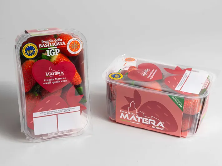 Fragola Matera® viene confezionata nel cestino Ezy Split: tecnologia hybrid da 400 grammi e da 500 grammi, in plastica R-Pet 100%, che coccola le fragole senza impattare sull’ambiente, con un logo che è una vera e propria cartolina della Basilicata.