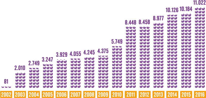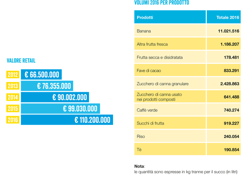 Il rapporto evidenzia come il “Premium” generato, aggiuntivo al “prezzo equo” pagato ai produttori, nel 2016, si stima sia pari a 1 milione e 304 mila euro: per le banane si tratta ci 559 mila euro, poi cacao 152.500 euro, caffè 301 mila euro, zucchero 203.500 euro, tè 88 mila euro. A livello mondiale vale 138 milioni di euro.