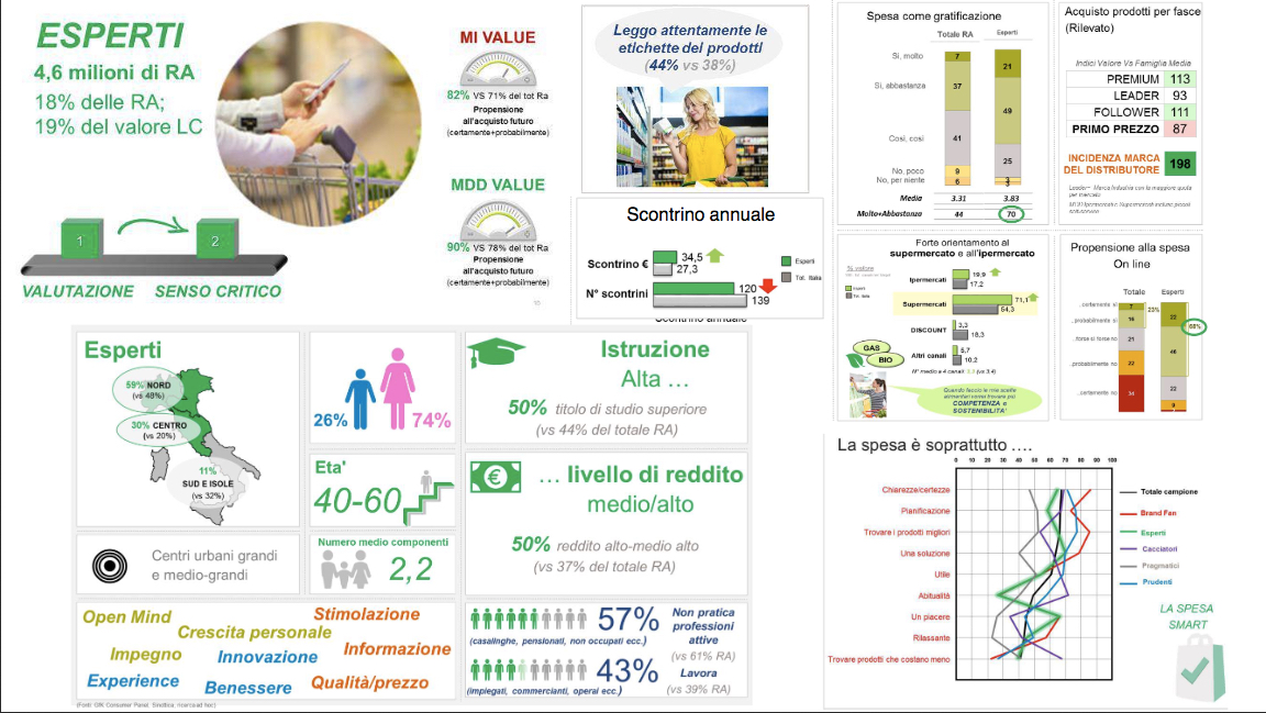 GFK ha suddiviso i clienti della Gdo in 5 categorie: pragmatici, esperti, brand fan, cacciatori e prudenti. I pragmatici frequentano soprattutto i canali tradizionali e i discount e si orientano su prodotti di primo prezzo, i brand fan sono i giovani tra i 30 e 50 anni che mediamente acquistano prodotti a prezzo più alto cercandoli nelle categorie premium e leader e preferiscono la marca industriale, i cacciatori si orientano rispettivamente su discount e prodotti di primo prezzo, hanno un reddito medio basso e sono concentrati nel sud italia e nelle isole mentre i clienti prudenti si affidano alla marca nota, hanno un’età matura e si concentrano nel sud italia. Il cliente che più di tutti si orienta verso la MDD è il cliente esperto, ma, hanno sottolineato Minoia e Nardone, anche in altre categorie, soprattutto nei cacciatori, si registra un’alta propensione ad acquistare la MDD nel futuro.