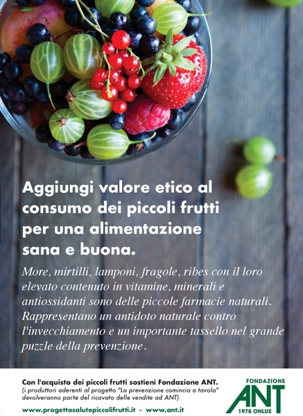 Il progetto ha come obiettivo principale quello di promuovere il consumo dei piccoli frutti, facendone conoscere e apprezzare al consumatore le proprietà benefiche per la salute: la partnership con la Fondazione ANT Italia Onlus, principale realtà italiana per le attività gratuite di assistenza specialistica domiciliare ai malati di tumore e per la prevenzione oncologica, è un tassello fondamentale dell’iniziativa, alla quale verrà devoluto il 7% del ricavato sulle vendite.