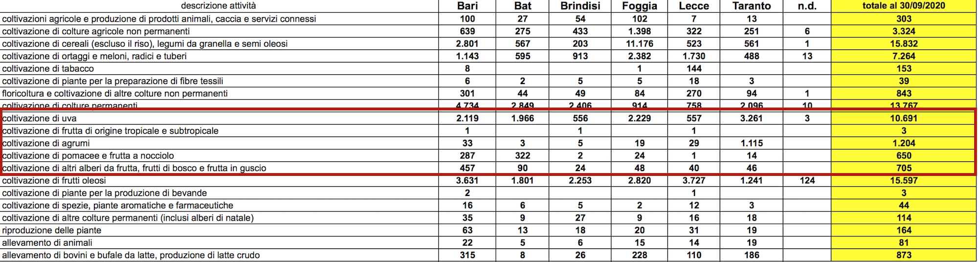 Di queste, 22.966 hanno sede legale in provincia di Foggia, 18.455 sono ubicate nel Barese, 10.474 in provincia di Taranto e 8.913 in quella di Lecce. Le restanti sono collocate tra la provincia di Barletta-Andria-Trani ( 8.856) e quella di Brindisi (7.335). Per le ultime 159 aziende, non si hanno indicazioni circa la collocazione geografica così come non si hanno notizie in merito agli orientamenti produttivi delle nuove imprese: myfruit.it sulla questione ha interpellato l'Osservatorio economico di Davide Stasi e anche Cia Puglia, ma al momento non sono pervenuti dettagli.