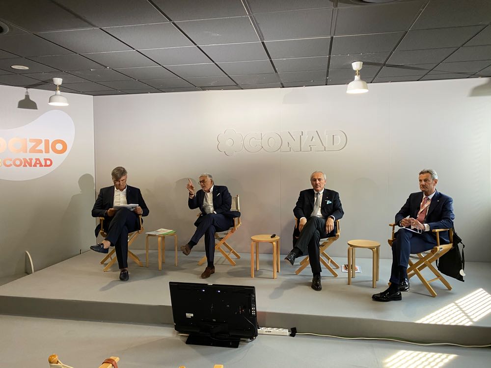 Conferenza stampa a Vimercate per la presentazione di Spazio Conad. Da sinistra: Francesco Avanzini, direttore generale, Francesco Pugliese, amministratore delegato, Luca Panzavolta, amministratore delegato di Cia (Commercianti indipendenti associati), Stefano Frescolla, socio e imprenditore dello Spazio Conad di Vimodrone