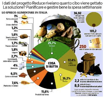 Dopo il monitoraggio su un campione statistico di 400 famiglie in Italia è emerso che gettiamo 100 grammi al giorno di cibo, vale a dire 36,92 Kg all'anno a testa, per un costo di circa 250 euro. Dai cosiddetti “Diari di Famiglia dello spreco” è così emerso che ogni famiglia, in media, butta 84,9 kg di cibo nel corso di un anno, circa 2,2 milioni di tonnellate di cibo in un anno, per un costo di 8,5 miliardi di euro, circa lo 0,6% del Pil del nostro Paese.