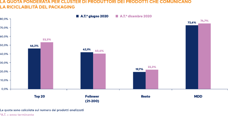 Risultato: il 74,7% delle confezioni di prodotti a marca del distributore vendute in supermercati e ipermercati spiega quanto sia riciclabile il packaging. Il dato è migliorato di +2,1 punti % rispetto all’anno finito a giugno 2020. Per le 20 imprese top, l’incidenza sulla numerica delle confezioni è inferiore (53,3%), ma il trend di crescita è decisamente più brillante (+9,2% annuo). Le aziende follower si fermano al 40,4% del numero delle confezioni vendute (-1,7%) e i fornitori minori al 22,3% (+2,6%).
