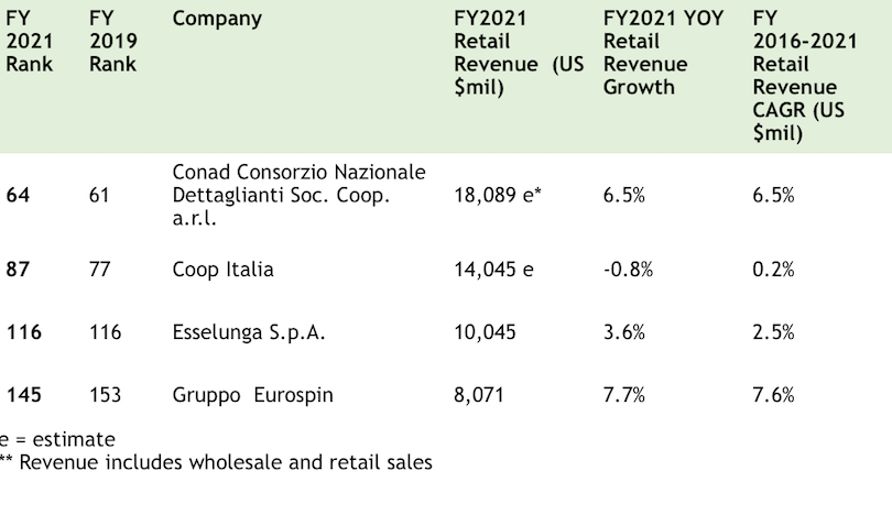 Tre su quattro dei player del nostro Paese presenti nella Top 250 chiudono l’anno con revenue YOY in crescita rispetto al FY2019, solo Coop subisce una leggera flessione. Nella Gdo, Conad si conferma il primo colosso italiano, collocandosi al 64esimo posto; seguono Coop in 87esimo posizione ed Esselunga al 116esimo; chiude Eurospin che guadagna otto posizioni grazie alle sue ottime performance, collocandosi al 145esimo posto della Top 250.