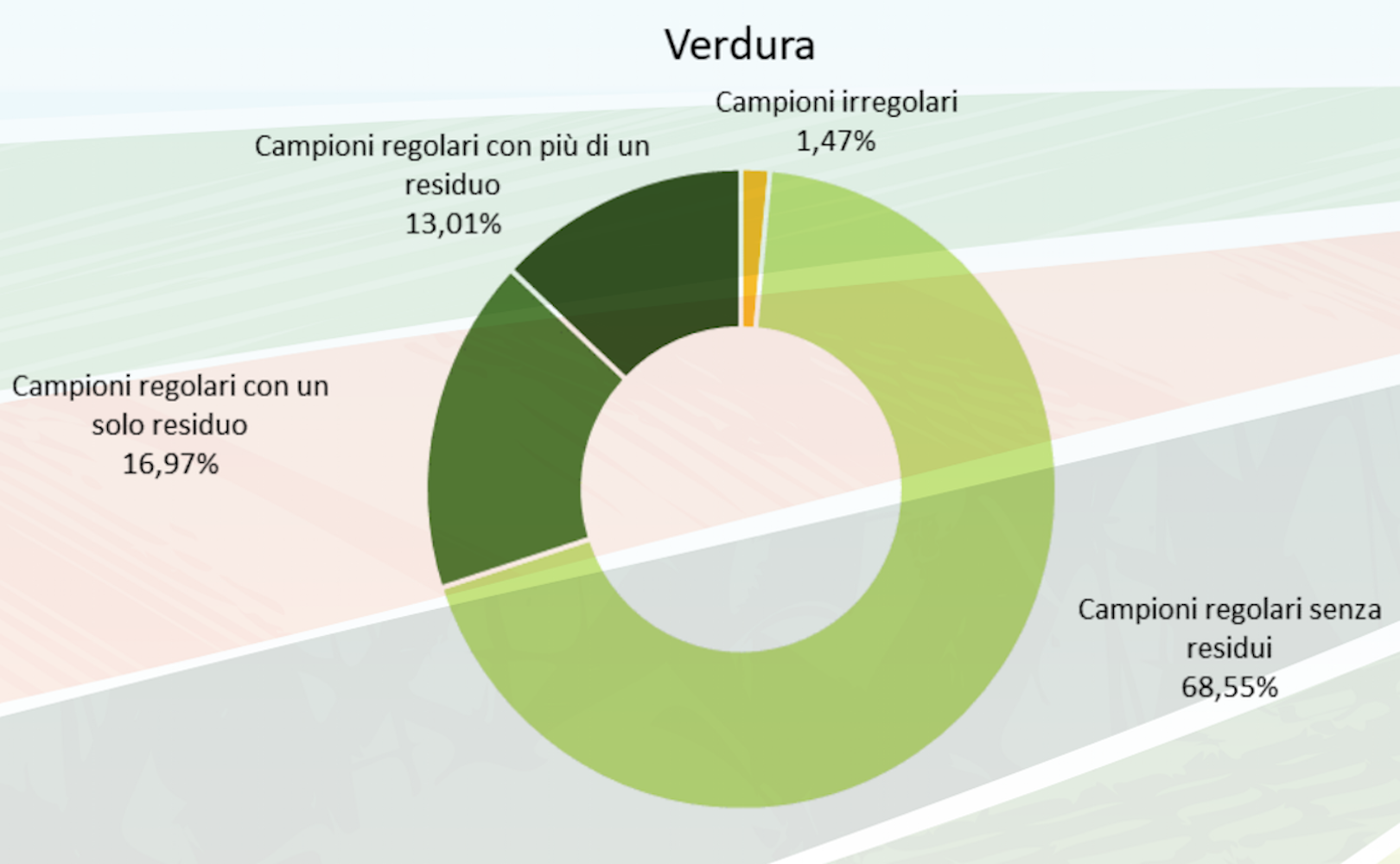 La verdura presenta percentuali molto più basse, con un multiresiduo nettamente inferiore (13,01%).