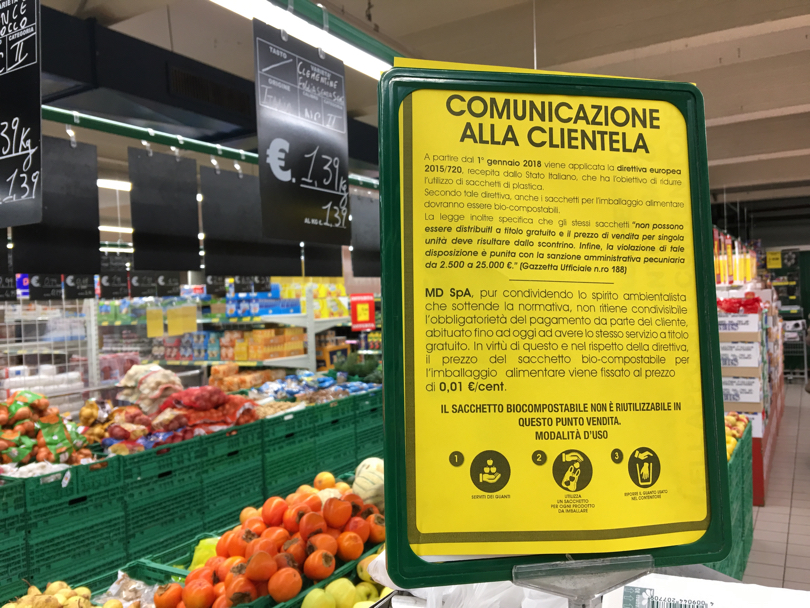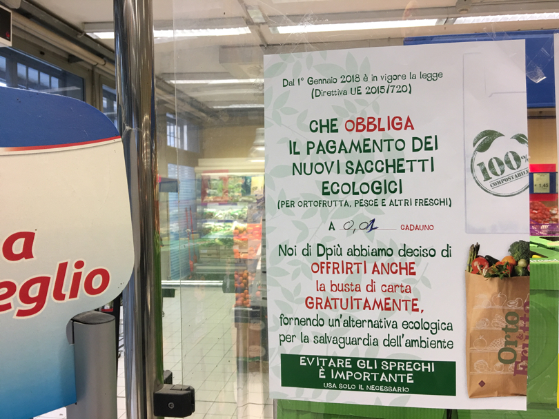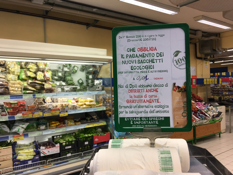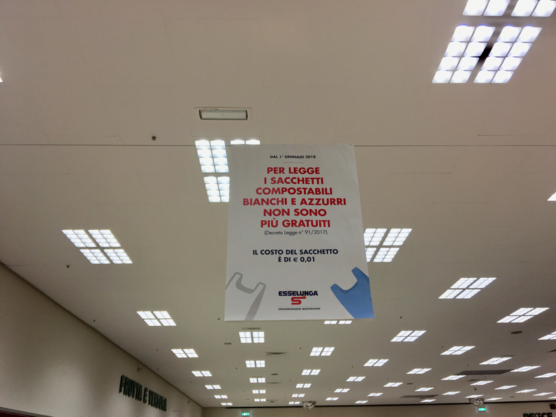 Nei giorni successivi l’entrata in vigore del decreto legislativo, siamo andati a visitare alcuni punti vendita di Milano e provincia, per vedere come alcune delle principali insegne della grande distribuzione organizzata e dei discount abbiano deciso di comunicare la novità ai propri clienti. I prezzi dei sacchetti biodegradabili, come abbiamo detto sopra, non superano i 2 centesimi ed è molto probabile che, per merito della concorrenza tra le diverse insegne, a breve si uniformeranno tutti sul minimo, vale a dire 1 centesimo (gratis, al momento, non è possibile per legge).