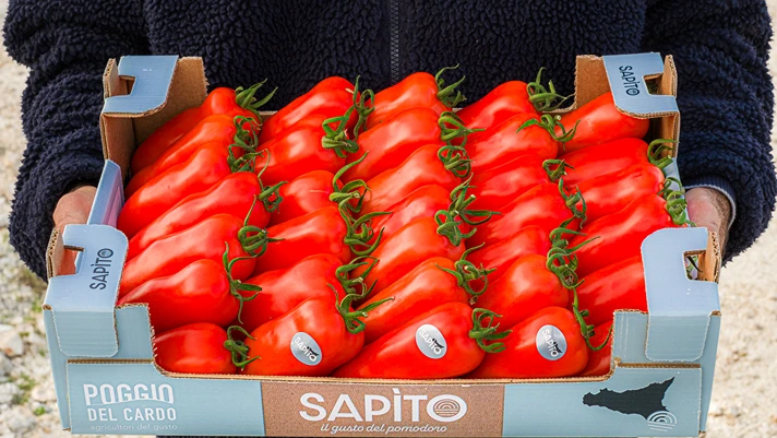 "Qui il mare incontra il pomodoro". Vincenzo Di Natale, terza generazione alla guida dell'azienda di famiglia Poggio del Cardo (siamo a Pachino, in provincia di Ragusa), presenta la candidatura al contest Best Fruit&Veg Box della cassa trasporto 30x40 (altezza 9,5 e 11,5 cm) per la linea di pomodori a elevato gusto Sapito, coltivati in serra, fuori suolo e irrigati con l'acqua salmastra del Mediterraneo.