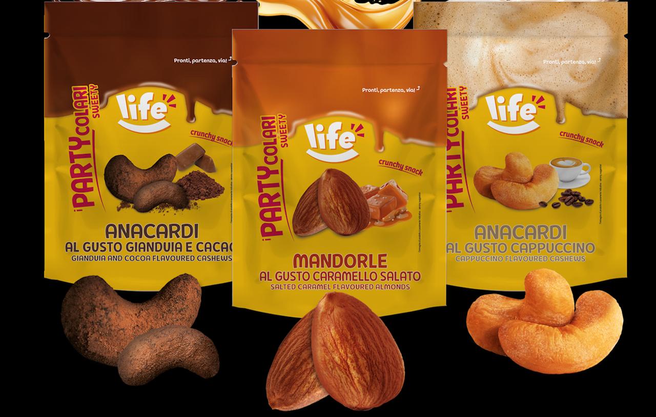 Infatti una delle grandi novità è la presentazione della linea i Partycolari sweety: mandorle al caramello salato, anacardi al cappuccino e anacardi al cacao gianduia. Tre prodotti che si aggiungono al precedente lancio della medesima linea in versione salata: dalle mandorle al gusto pizza fino alle nocciole al gusto tartufo, che hanno riscosso notevole successo.