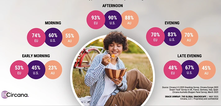 A differenza dei consumatori statunitensi, che sono quelli più inclini agli spuntini notturni, i consumatori europei prediligono gli snack mattutini. Gli australiani, invece, preferiscono le opzioni più salutari in qualsiasi momento della giorno.