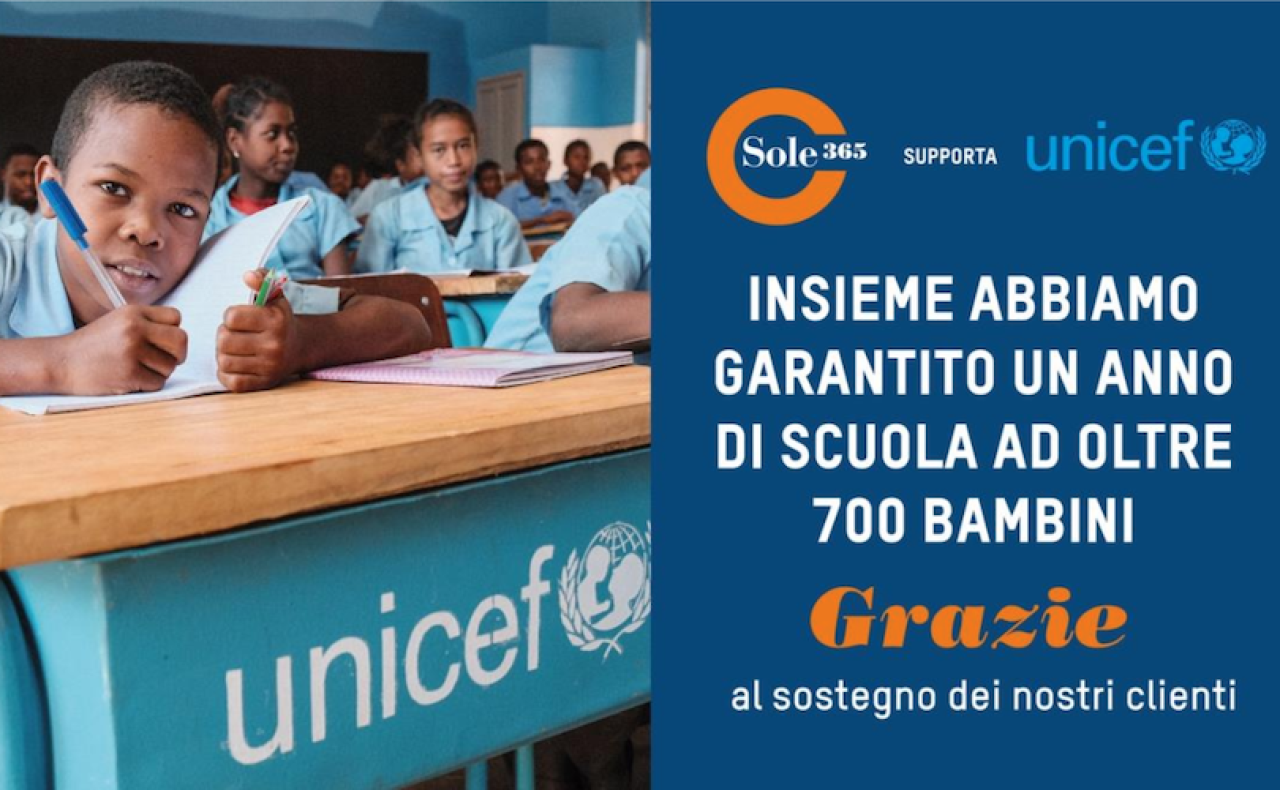 Essendo ancora oggi l’accesso all’istruzione un privilegio che non tutti possono avere, Sole365 ha deciso di contribuire alla causa supportando la missione dell’Unicef, che onorevolmente si impegna a livello globale per assicurare il diritto allo studio, con programmi e progetti mirati in oltre 190 Paesi nel mondo.