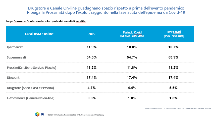 L'esplosione dell'online e le differenti modalità di acquisto hanno variato e continuano a modificare la geografia del commercio, anche se negli ultimi mesi si osserva un riallineamento delle dinamiche dei canali distributivi alla situazione pre-covid. Emerge, tuttavia, la crisi degli ipermercati, con un calo delle vendite del 9,6%, considerando complessivamente sia la fase covid sia quella successiva. Il commercio di prossimità, dopo il balzo del 16,1% nel lockdown, ha registrato una flessione del 3,2% nel periodo giugno-agosto. Tra chi invece accelera, si trovano “specialisti casa e persona” (+11,7% post lockdown) e continua il forte sviluppo degli acquisti lcc (largo consumo confezionato) nel canale virtuale (+96,4%).