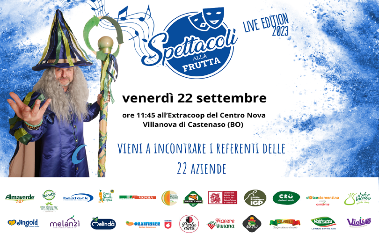 E ora si riparte, con la seconda parte in autunno! Spettacoli alla Frutta è il progetto di filiera che mette insieme 22 aziende leader del settore ortofrutticolo, unite per promuovere un nuovo modo di fare cultura sulla frutta e la verdura del Belpaese, nell’ottica di rilanciare i consumi e nell’interesse di tutta la filiera, dalla produzione al retailer, dall’indotto al consumatore. Per farlo hanno scommesso insieme su un’iniziativa innovativa e fuori dagli schemi, che ora torna per quattro weekend in alcuni punti vendita di quattro gruppi distributivi, da Nord a Sud.