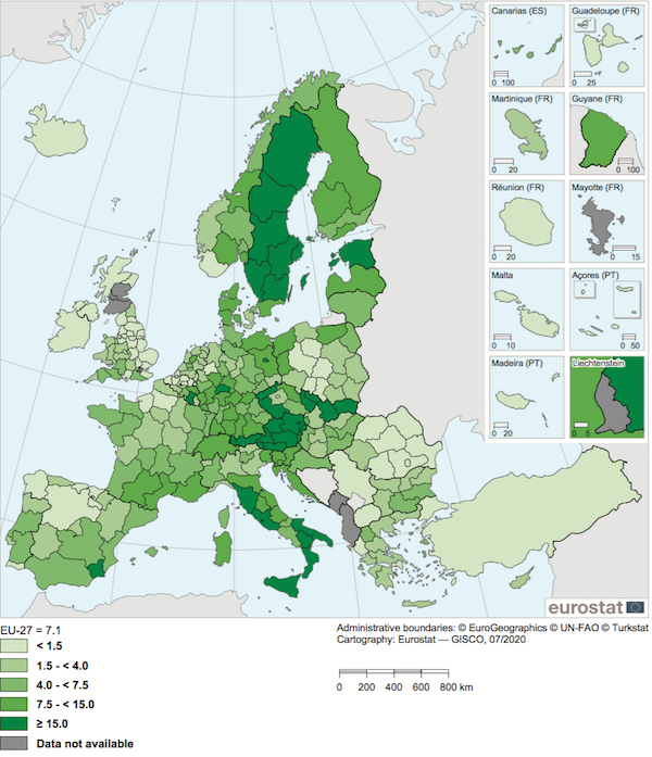 Secondo Eurostat, la superficie biologica dell'Unione europea a 27 ammonta a 11,4 milioni di ettari, il che significa il 7,1% della superficie agricola utilizzata (sau) totale. Di questi, 2 milioni sono italiani. L'unica regione europea in cui il metodo bio ha superato il metodo convenzionale però si trova fuori dai nostri confini: si tratta di Salisburgo (Austria), che vanta il 51,8% della sau convertita, pari a circa 93mila ettari. La Calabria è la terza in classifica, con quasi il 30%. Sempre secondo Eurostat, sei regioni italiane – e cioè Liguria, Val d'Aosta, Abruzzo, Basilicata, Umbria e Toscana – sono tra le prime dieci per l'incremento di superfici coltivate con metodo biologico nell'ultimo triennio. Sicilia, Puglia e Calabria insieme rappresentano il 43% della superficie agricola biologica nazionale e il 39% delle aziende agricole bio.