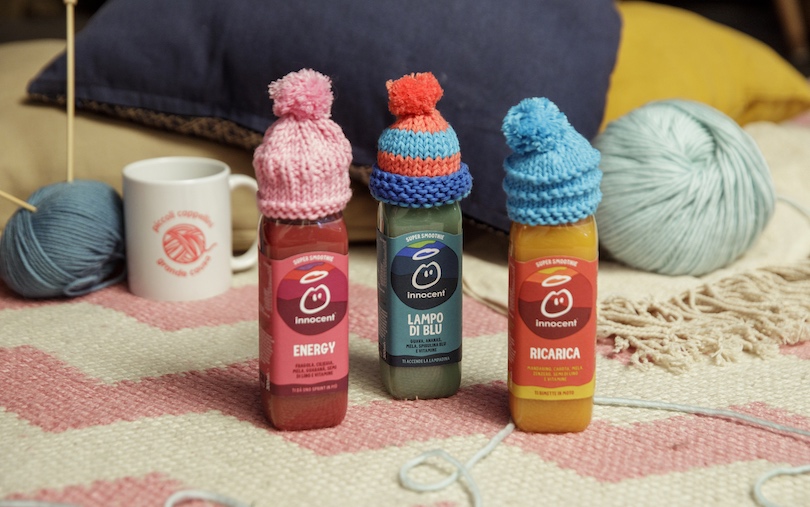 Da quattro anni, in Italia, innocent chiede a tanti volonterosi di sferruzzare piccoli cappellini di lana. Cappellini che vengono indossati dalle bottiglie di smoothie. Per ogni bottiglia venduta 0,20 euro vengono donati ad Auser Lombardia, associazione di volontariato che si dedica a favorire l’invecchiamento attivo degli anziani e quindi portare loro calore, supporto e compagnia. In tutta Europa negli anni la campagna ha già raccolto centinaia di migliaia di cappellini, grazie ai quali sono stati già donati in beneficenza oltre 3 milioni.