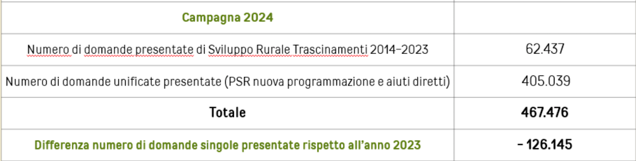 A queste si aggiungono le 62.437 istanze relative allo sviluppo rurale della vecchia programmazione che seguono il precedente iter amministrativo al di fuori della domanda unificata.