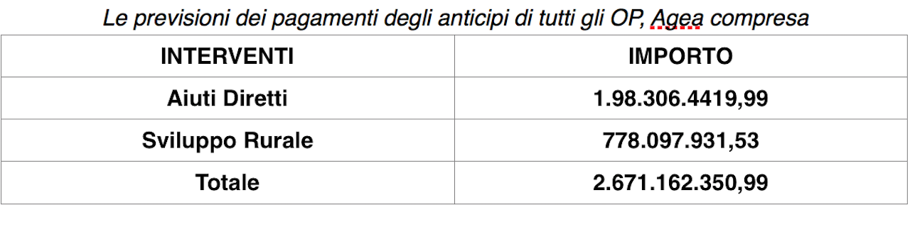 Le percentuali di anticipazioni applicate sono quelle massime previste dalla recente disposizioni Ue e sono pari al 70% per gli aiuti diretti e all’85% per lo sviluppo rurale, salvo alcune eccezioni dovute alla tipologia delle misure richieste.