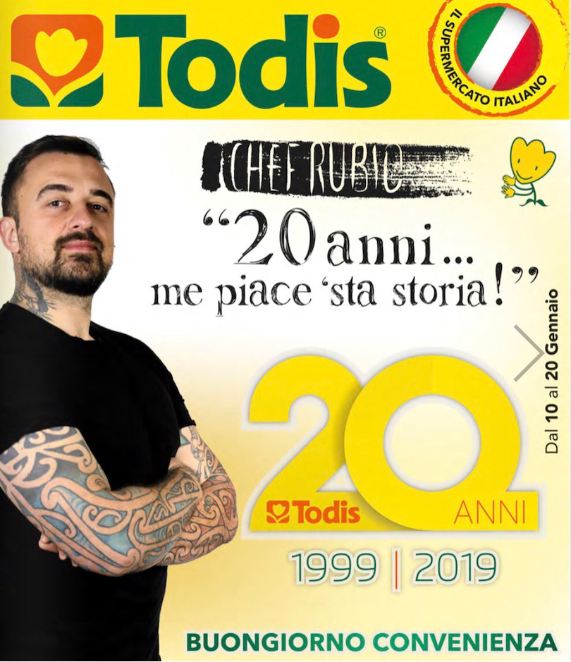 Presente con 230 punti vendita nel centro e sud Italia, Todis nel 2019 compie 20 anni e per festeggiare l'anniversario ha deciso di lanciare un'iniziativa dal titolo “La Spesa per Tutti“, che vede coinvolto come testimonial Chef Rubio, ex rugbista e noto volto televisivo protagonista di trasmissioni che hanno come protagonista la cucina popolare, e il sostegno della Comunità di Sant'Egidio.