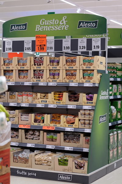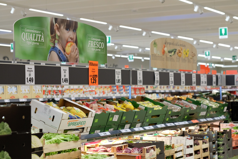 L’ortofrutta? Accoglie i clienti come primo reparto subito dopo l’ingresso: si sviluppa più in lungo più che in largo, con un buon numero di referenze e la presenza di non pochi marchi noti al grande pubblico o referenze a denominazione legate a specifici territori: le mele della Val Venosta e quelle Pink Lady, le pere di Opera e quelle griffate Angelys, le cipolle borretane di Delfanti, l’ananas di Dole, l’arancia rossa di Sicilia, la carota novella di Ispica, i funghi a marchio Fungo Italiano Certificato o ancora il radicchio di Tosatto, sono alcune delle referenze ben conosciute dal grande pubblico. Di discreta profondità il lineare dedicato alla quarta gamma, praticamente tutto a marchio privato e in questo momento quasi tutto a 0,99 euro.