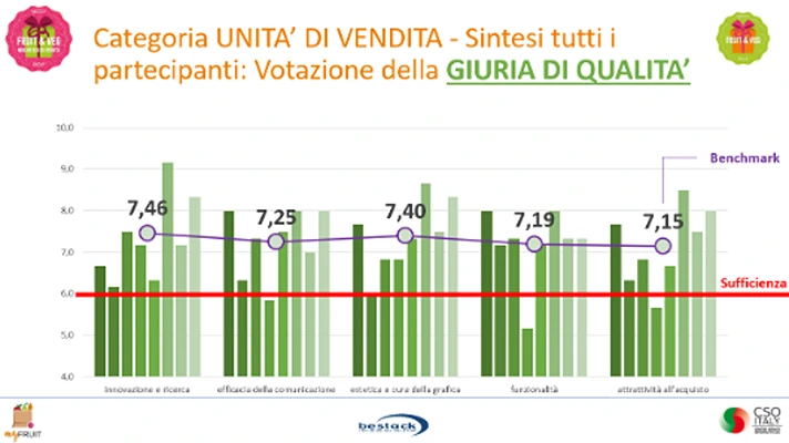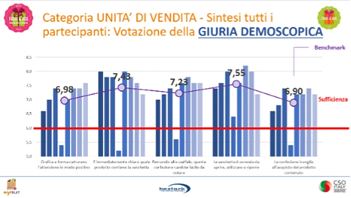La giuria di qualità ha assegnato alla categoria un voto medio di 7,29, leggermente superiore ai 7,23 degli imballaggi di trasporto. Sette su otto candidati hanno ricevuto valutazioni decisamente sufficienti, tre vicini all’8. Solo un candidato ha mostrato insufficienze in comunicazione, funzionalità e attrattività.