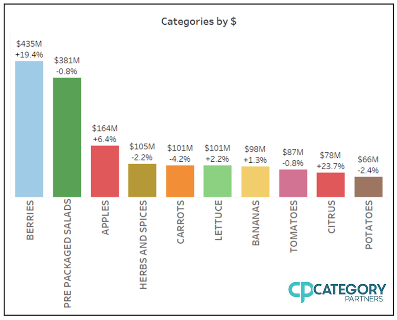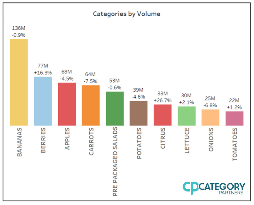 Le prime 10 categorie di prodotti biologici hanno mostrato nel secondo trimestre del 2021 risultati variabili, sia nelle vendite sia nel volume: le mele, la lattuga, le banane e gli agrumi hanno registrato un aumento delle vendite, con i frutti di bosco in testa nell'incremento a volume, insieme ad agrumi, lattuga e pomodori.