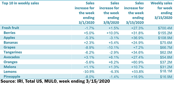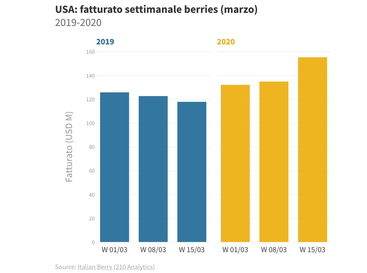 Proprio la categoria dei berries ha generato più di un quinto dell’intero fatturato del reparto ortofrutta. In particolare, le vendite dei piccoli frutti sono aumentate a valore di quasi il 32% nella settimana 11 rispetto alla stessa settimana del 2019, raggiungendo in soli sette giorni il fatturato di 155 milioni di dollari, superiore a quello delle mele e più che doppio rispetto a quello delle banane. Il fatturato era già aumentato del 10% nella settimana precedente e del 5% nella settimana del primo marzo, sempre in confronto agli stessi periodi dell'anno scorso.