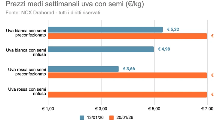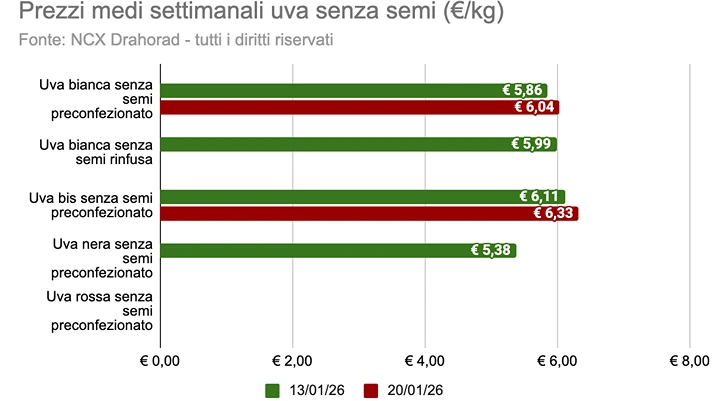Le maggiori variazioni nei prezzi medi si sono riscontrate nelle seguenti referenze: uva bianca con semi (+35,5%), uva rossa senza semi (+13,3%), totale generale (+6,9%).