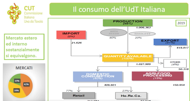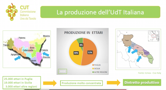 Come è noto, la produzione di uva da tavola è concentrata in Puglia e Sicilia e si attesta sul milione di tonnellate. Di queste, circa il 50% sono esportate: “Il distretto produttivo non deve essere definito, esiste già ed è lampante – ha precisato Del Core – Quanto agli sbocchi commerciali, la nostra produzione è assorbita dall‘Unione europea, Svizzera e Regno Unito, ma dobbiamo trovare delle alternative”. Secondo quanto riferito Del Core, infatti, quello europeo è un mercato saturo, che rappresenta sì un'opportunità, ma che presenta anche delle insidie. Per esempio la concorrenza di Grecia e Spagna: “Con l'aiuto del Cso Italy – ha spiegato il presidente – la Cut sta lavorando su alcuni potenziali mercati oltremare, in particolare Sud Africa, Cina, Tailandia e Vietnam. Ma i tempi non sono immediati”.