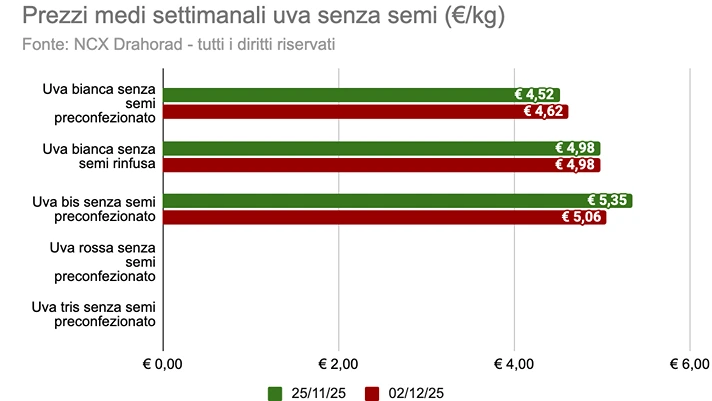 Nel giorno della rilevazione (02/12/25) erano in promozione le seguenti insegne: Amazon (uva bianca con semi Victoria preconfezione da 500 g a 1,69 euro; uva nera con semi preconfezione da 500 g a 1,85 euro); Easy Coop (uva bianca senza semi preconfezione da 500 g a 1,98 euro; uva rossa senza semi preconfezione da 500 g a 2,58 euro); Esselunga (uva bianca senza semi preconfezione da 500 g a 1,98 euro; uva tris senza semi preconfezione da 800 g a 3,98 euro); Famila (uva bianca senza semi preconfezione da 500 g a 2,45 euro); Decò (uva rossa con semi Red Globe preconfezione da 1.000 g a 2,39 euro).