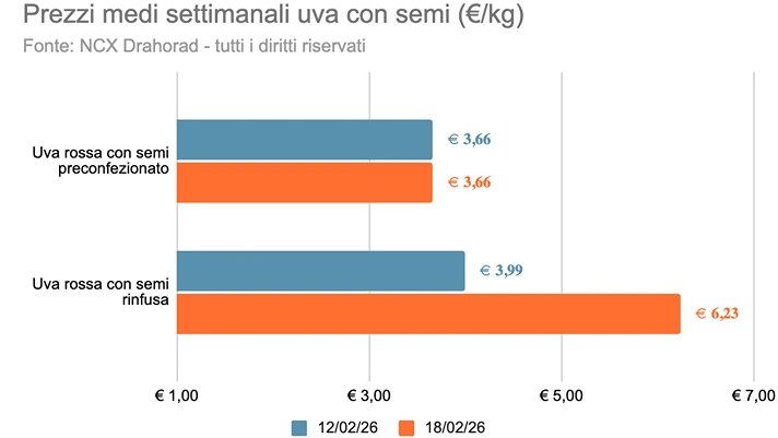 Il prodotto con il prezzo al chilo mediamente più basso è l'uva rossa con semi (3,77 euro/kg), in linea con la settimana scorsa. La referenza con il prezzo al chilo medio più elevato è stata l'uva rossa senza semi (6,23 euro/kg), con una variazione del +3,9% rispetto alla settimana precedente.