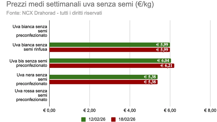 Nel giorno della rilevazione (18/02/26) erano in promozione le seguenti insegne: Esselunga (uva bianca senza semi preconfezione da 500 g a 2,95 euro); Eurospin (uva bianca senza semi preconfezione da 500 g); Amazon (uva bianca senza semi preconfezione da 500 g; uva rossa senza semi preconfezione da 500 g a 2,37 euro).