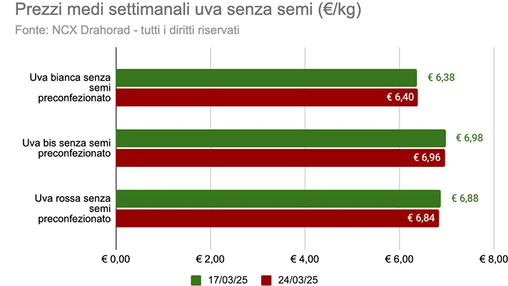 Il prezzo per l'uva bianca con semi in rinfusa è rimasto stabile a 4,49 euro/kg, con Decò che offre il prezzo minimo e massimo.