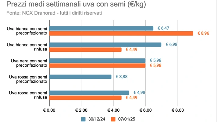 Il prezzo per l'uva bianca con semi in rinfusa è stato 4,49 euro/kg (Italia) in vendita da Decò.