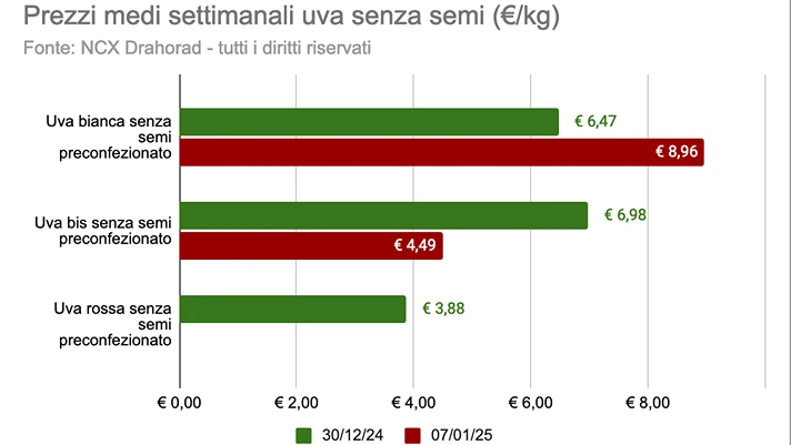 Il prodotto con il prezzo per chilo mediamente più basso è l'uva rossa con semi (4,49 eurokg), con una variazione del +5,8% rispetto alla settimana precedente. La referenza con il prezzo/kg medio più elevato è stata l'uva bis senza semi (8,47 euro/kg come la settimana precedente).