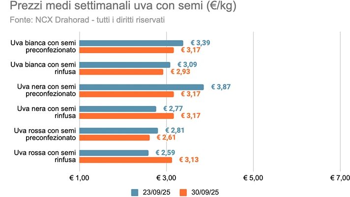 Il prodotto con il prezzo al chilo mediamente più basso è l'uva rossa con semi (2,89 euro/kg), in aumento del 6,7% rispetto alla settimana precedente; la referenza con il prezzo al chilo medio più elevato è stata l'uva bis senza semi (4,85 euro/kg), in calo del 4,4% rispetto alla settimana precedente.