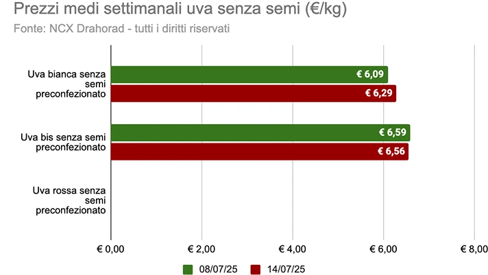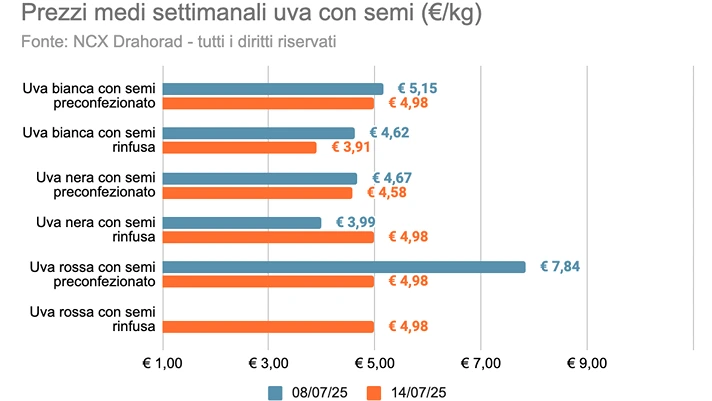 Il prezzo medio della categoria è stato pari a 5,61 euro/kg, con una variazione del +0,3% rispetto alla settimana precedente. Il prodotto con il prezzo al kg mediamente più basso è l'uva bianca con semi (4,49 euro/kg), con una variazione del -8,6% rispetto alla settimana precedente. La referenza con il prezzo al kg medio più elevato è stata l'uva rossa con semi (7,84 euro/kg), con una variazione del +27,2% rispetto alla settimana precedente.