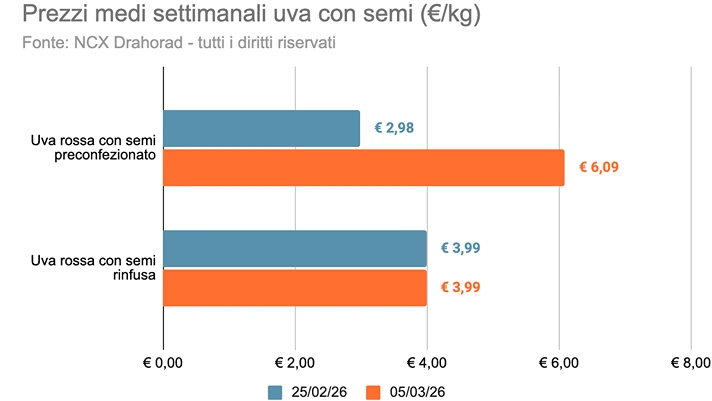 Il prezzo medio della categoria (escludendo biologico e premium) è stato pari a 5,75 euro/kg, con una variazione del -1,2% rispetto alla settimana precedente. Il prodotto con il prezzo al kg mediamente più basso è l'uva rossa con semi (5,39 euro/kg), con un balzo del +54,5% rispetto alla settimana precedente, mentre la referenza con il prezzo al kg medio più elevato è stata l'uva bianca senza semi (6,24 euro/kg), con una variazione del +2,4% rispetto alla settimana precedente.