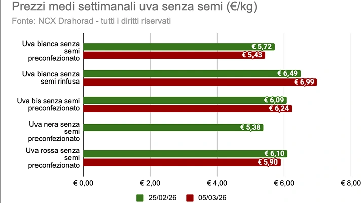 Il prezzo medio per l'uva bianca senza semi in rinfusa è stato 6,99 euro/kg in vendita da Italmark.