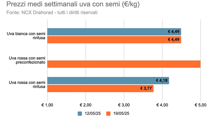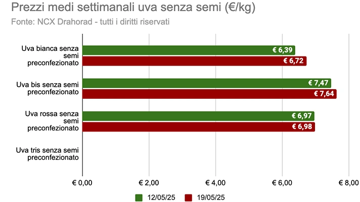 Il prezzo medio della categoria è stato pari a 6,23 euro/kg, con una variazione del +8,2% rispetto alla settimana precedente. Il prodotto con il prezzo al chilo mediamente più basso è l'uva bianca con semi (4,49 euro/kg), stesso prezzo della settimana precedente. La referenza con il prezzo al chilo medio più elevato è stata l'uva bis senza semi (7,64 euro/kg), con una variazione del +2,3% rispetto alla settimana precedente.