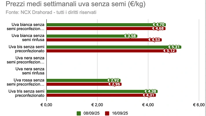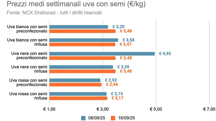 Il prezzo medio della categoria (escludendo biologico e premium) è stato pari a 4,19 euro/kg, in linea con la settimana precedente. Il prodotto con il prezzo al kg mediamente più basso è l'uva rossa con semi (3,05 euro/kg), con una variazione del +1,3% rispetto alla settimana precedente. La referenza con il prezzo al kg medio più elevato è stata l'uva bis senza semi (5,12 euro/kg), con una variazione del -3,6% rispetto alla settimana precedente.