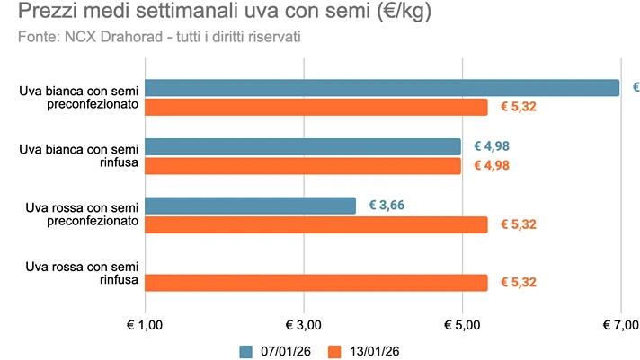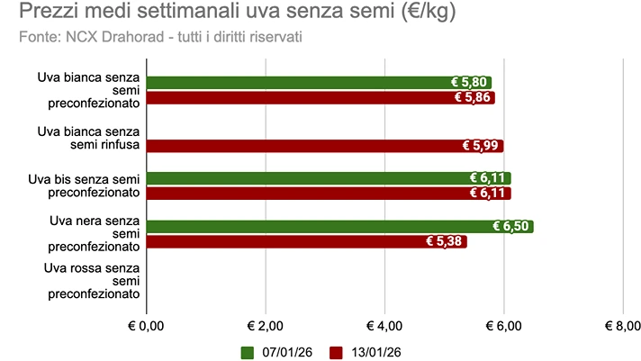Le maggiori variazioni nei prezzi medi si sono riscontrate nelle seguenti referenze: uva nera senza semi (-17,2%), uva bianca con semi (-13,9%), uva bianca senza semi (+1,2%).